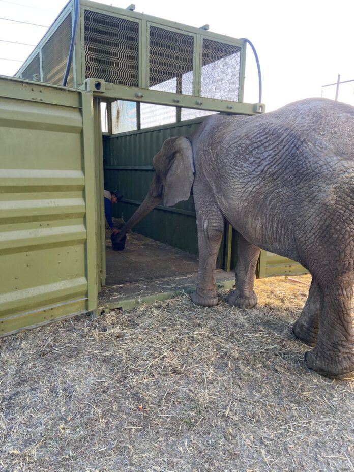 El procedimiento para poder realizar el traslado inició ese mismo día con la colocación de un contenedor de acero en color verde de 2.44 metros de ancho, por 3.60 metros de alto, por 6.07 metros de largo, a un costado de la jaula, para que el ejemplar pudiera explorar el espacio y se familiarizara con él.