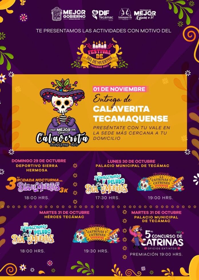 También este día se llevará a cabo el concurso de las Catrinas y Catrines Vivientes, en donde se mostrará la creatividad de los tecamaqueneses, para conservar una de las tradiciones más arraigadas en México. Estas actividades también se realizarán en el martes 31 de octubre en los Héroes Tecámac.