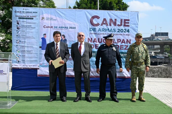Con el objetivo de reducir la incidencia delictiva, el gobierno de Naucalpan instaló un módulo del programa ‘Canje de Armas 2024’, en coordinación con autoridades estatales y federales, mediante el cual habitantes del municipio podrán entregar de manera anónima y sin ninguna investigación armas de fuego, cartuchos o artefactos explosivos, a cambio de dinero en efectivo.