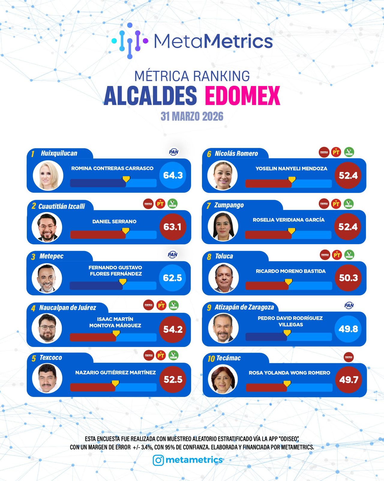 El estudio posiciona al edil izcallense dentro del top 3 estatal, junto a dos gobiernos emanados del Partido Acción Nacional (PAN): la alcaldesa de Huixquilucan y el presidente municipal de Metepec, lo que lo convierte en el único representante de Morena en los primeros lugares de la medición.