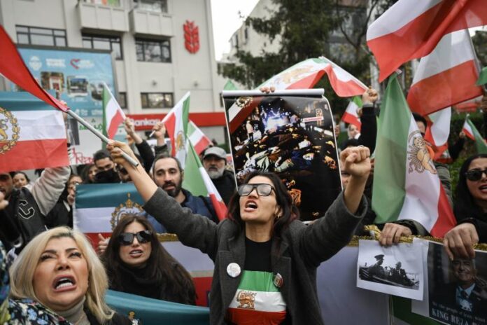 Ciudadanos iraníes residentes en Grecia sostienen banderas de Irán anteriores a la revolución de 1979, con los emblemas del león y el sol, durante una manifestación en apoyo del pueblo iraní frente a la Embajada de Irán en Atenas el 16 de enero de 2026.AFP