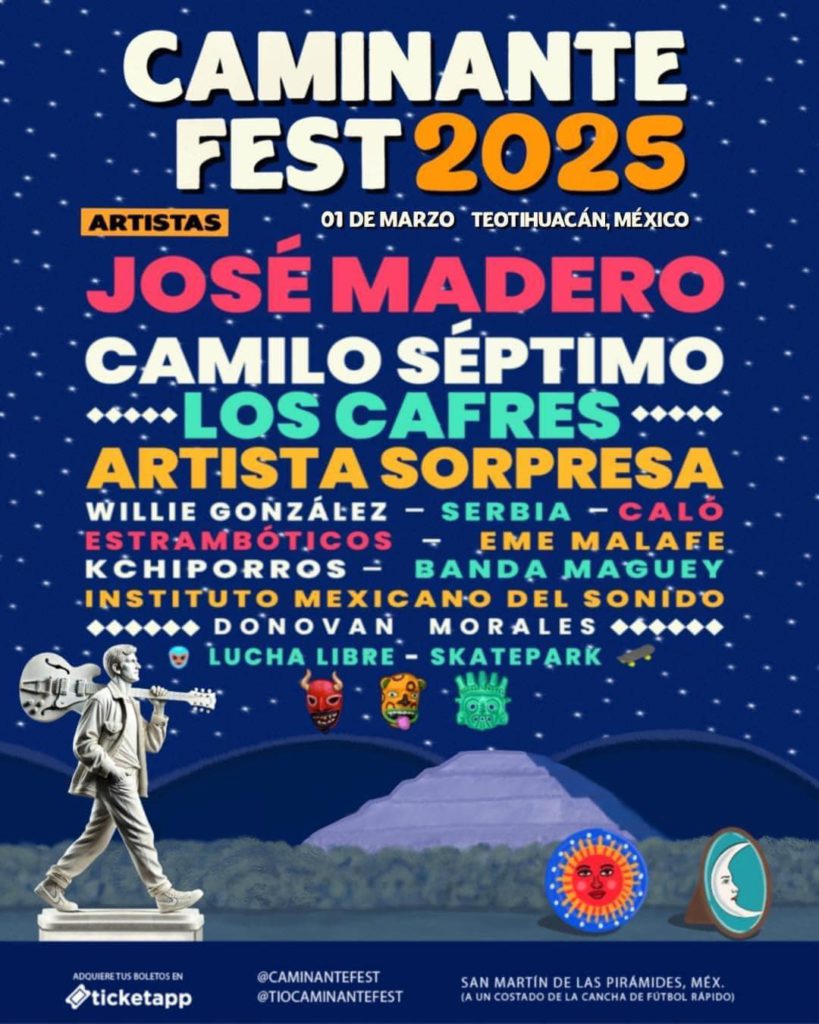 El Festival Caminante 2025 se presenta como una experiencia inigualable en el mágico escenario de Teotihuacán, un lugar emblemático que ha sido testigo de siglos de historia y tradición. Este evento reunirá el próximo sábado 1 de marzo a algunos de los nombres más importantes de la música en español, fusionando arte, cultura y el imponente paisaje de las pirámides para ofrecer a los asistentes una experiencia que trasciende lo musical. Boletos a la venta en el Sistema Ticketapp y en puntos de venta autorizados en https://lc.cx/TOugP7