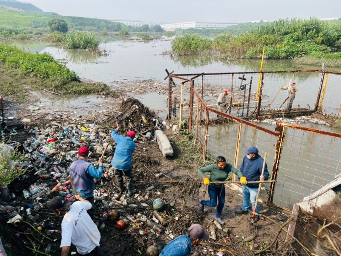 Luego de las intensas lluvias registradas en los últimos días, el gobierno municipal que preside la Mtra. Karla Fiesco García informa que personal de Operagua Izcalli, Servicios Públicos, Protección Civil y Bomberos, Obras Públicas y la Comisión del Agua del Estado de México (CAEM), realizan trabajos de limpieza y desazolve en la presa El Ángulo, además de mantener un monitoreo permanente en el embalse durante todo el año.