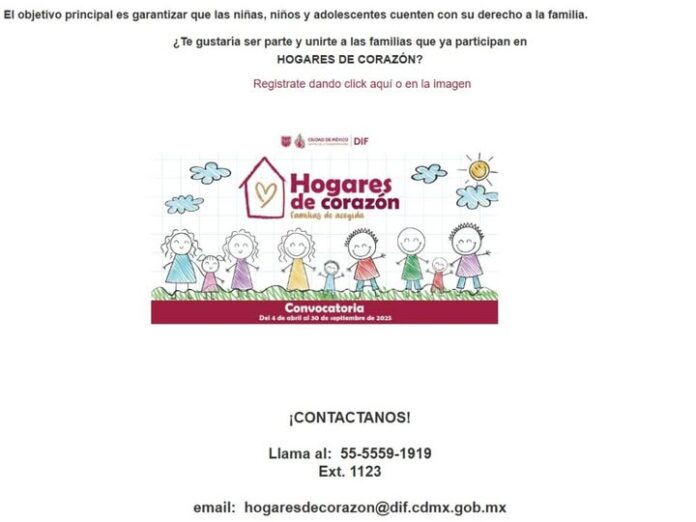 A partir de este viernes 4 de abril y hasta el 30 de septiembre, el Sistema para el Desarrollo Integral de la Familia (DIF) de la Ciudad de México abrió la convocatoria pública “Bienestar Hogares de Corazón” 2025, con el objetivo de registrar a personas interesadas en brindar acogimiento temporal sin fines de adopción a niñas, niños y adolescentes que se encuentran en situación de riesgo, sin cuidado parental o bajo resguardo institucional.