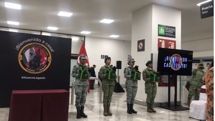 Con honores y una guardia muy perruna, la mañana de este martes llegó al Aeropuerto Internacional de la Ciudad de México, el cachorro de Pastor Alemán que fue donado por Turquía tras la muerte de “Proteo”, quien falleció durante las labores de rescate en ese país.
