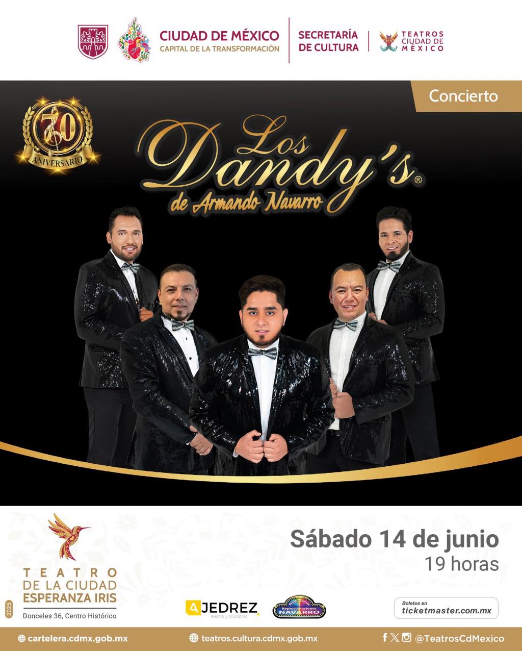 El próximo Sabado 14 de Junio el TEATRO DE LA CIUDAD ESPERANZA IRIS de la Ciudad de México abrirá sus puertas para celebrar una velada inolvidable con los Dandys rumbo a su 70 aniversario con invitados especiales. Esta cita promete revivir la esencia romántica de un género que ha dejado una marca indeleble en la historia musical de Latinoamérica. Con una propuesta que busca no solo homenajear los éxitos del pasado, sino también reavivar el amor por el bolero en las nuevas generaciones, la tarde del Sábado 14 de Junio será un auténtico viaje en el tiempo, plagado de emoción y nostalgia. Boletos a la venta en el Sistema Ticketmaster y en taquillas del inmueble.