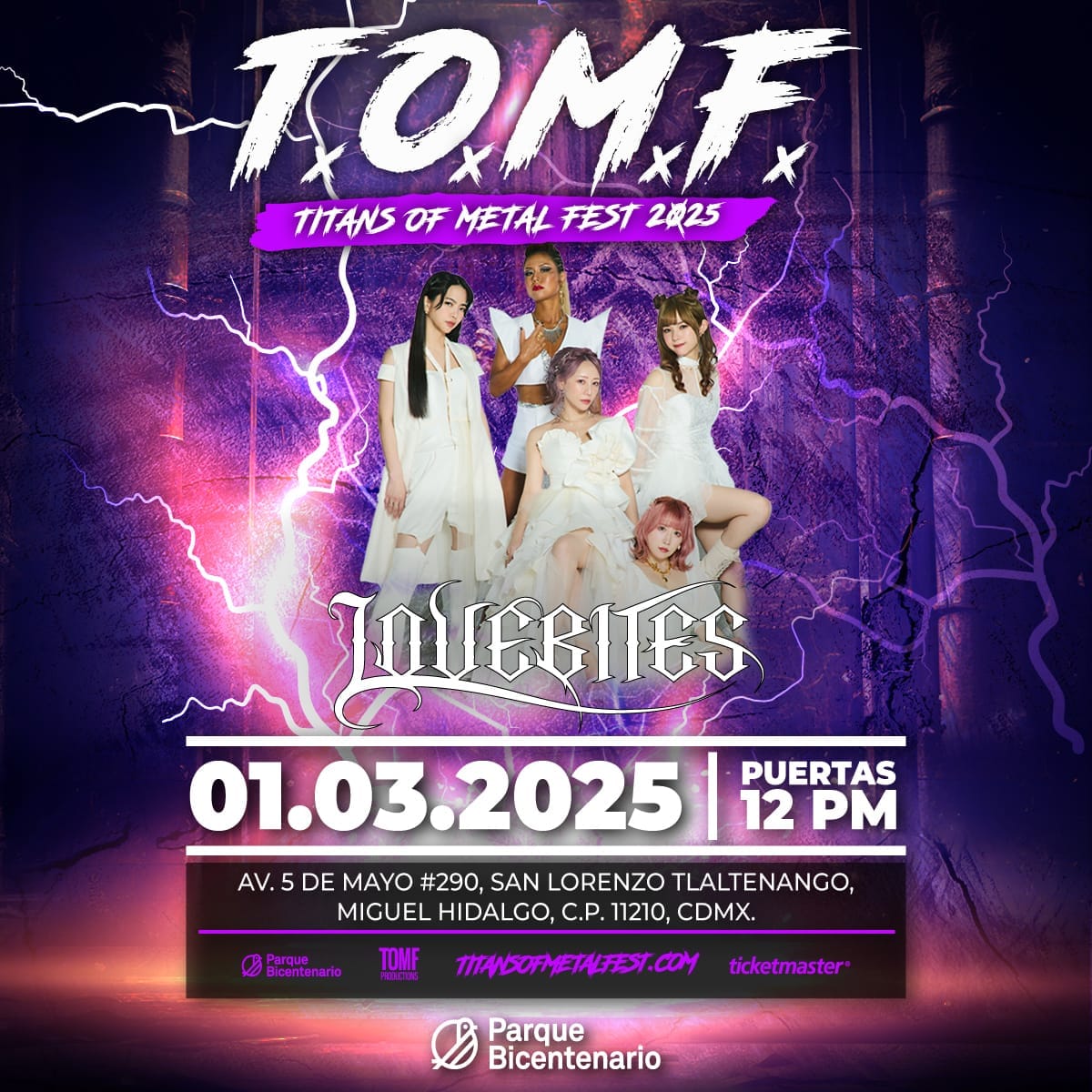 La escena del metal internacional está de fiesta. Lovebites, la icónica banda japonesa de power metal, ha confirmado su participación en el prestigioso Titans of Metal Fest, que se llevará a cabo el 1 de marzo de 2025 en el Parque Bicentenario de la Ciudad de México. Este evento, organizado por TOMF Productions, promete ser uno de los festivales más destacados del año, reuniendo a algunas de las agrupaciones más influyentes y respetadas del heavy metal, power metal, thrash y otros subgéneros extremos.