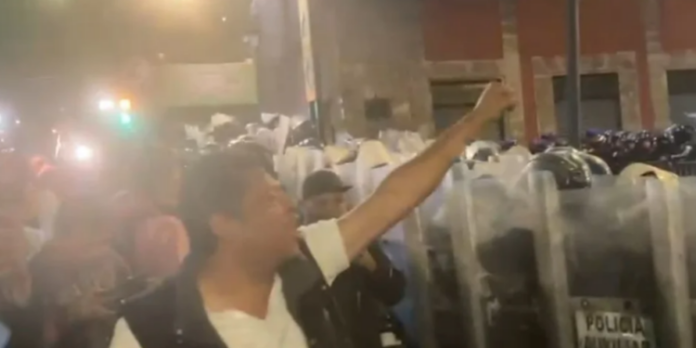 En las imágenes que circulan en redes sociales, se aprecia cómo la gente trata de adentrarse entre los uniformados de la Ciudad de México, aunque sin éxito. Algunos de los manifestantes han tratado también de arrebatarles a los policías sus escudos antidisturbios.