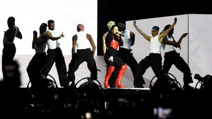 ‘La Motomami’ vistió un atuendo completamente negro con un corset y botas rojas, acompañada de sus bailarines, todos con los icónicos cascos de motociclista.