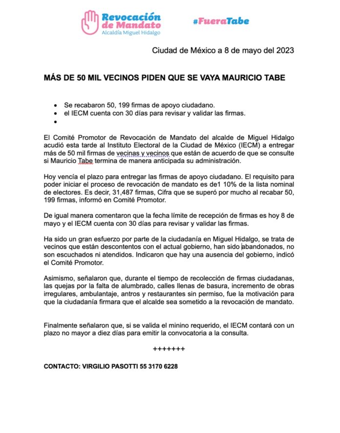 El Comité Promotor de Revocación de Mandato del alcalde de Miguel Hidalgo acudió esta tarde al Instituto Electoral de la Ciudad de México (IECM) a entregar más de 50 mil firmas de vecinas y vecinos que están de acuerdo de que se consulte si Mauricio Tabe termina de manera anticipada su administración.