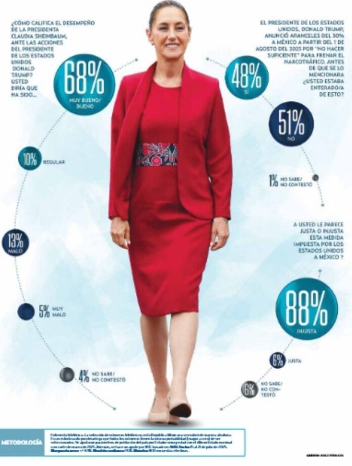 Además, la gran mayoría de mexicanos y mexicanas rechaza las medidas del mandatario estadounidense de imponer aranceles a nuestro país. A la pregunta de: “A usted le parece justa o injusta esta medida impuesta por los Estados Unidos a México de poner un arancel de 30 por ciento a partir del 1 de agosto de 2025?”, un contundente 88 por ciento señaló que es “Injusta”.