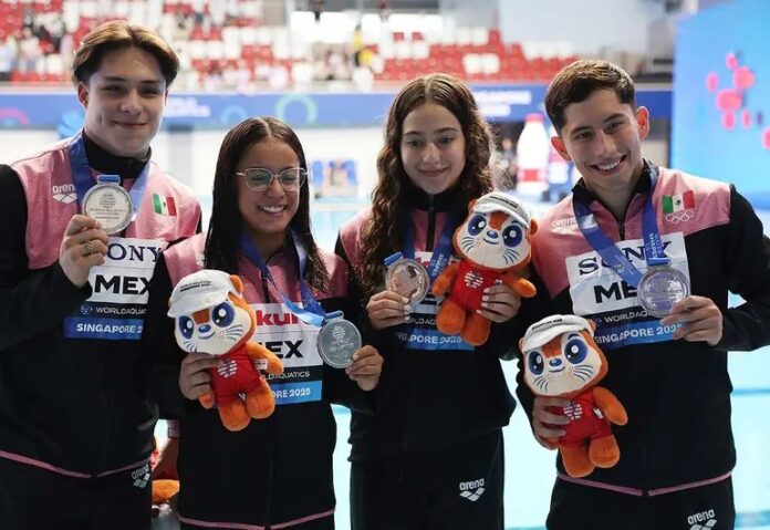 México consiguió su primera medalla en el Campeonato Mundial de Deportes Acuáticos de Singapur 2025, luego de que Osmar Olvera, Alejandra Estudillo, Zyanya Parra y Randal Willars obtuvieran la presea de plata en la prueba mixta de 3 y