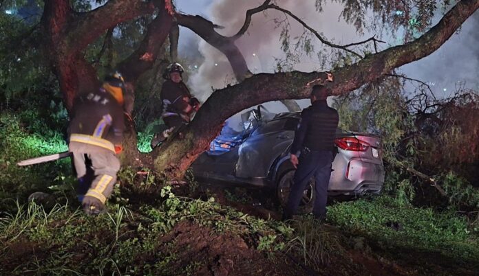 El vehículo se subió al camellón y siguió de largo unos cinco metros hasta que se estampó contra un árbol, en el impacto el tronco terminó incrustado en el frente de la camioneta y la conductora atrapada al interior.