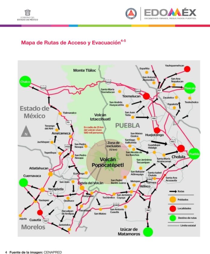 Detalló que uno de los municipios contemplado para una posible evacuación sería Ecatzingo, cuya población tendría que cruzar por los municipios de Atlautla y Ozumba, rumbo a Chalco, lo que “formaría un nudo”, por lo que se han planteado rutas alternas de salida hacía San Pedro Nexapa de Amecameca y Tetela del Volcán, del estado de Morelos; sin embargo, las vialidades no se encuentran en buenas condiciones. “Lo vivimos en el sismo del 2017 donde quisimos transitar de Ecatzingo hacia Tetela del Volcán y prácticamente es terracería”.