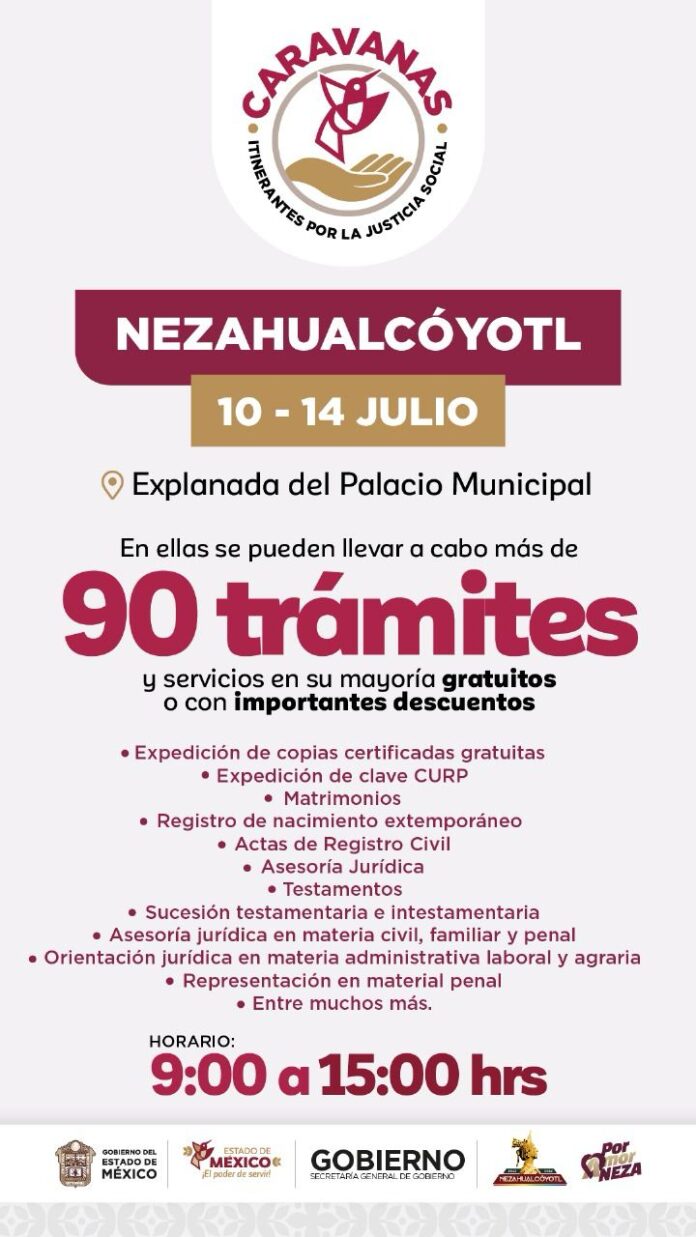Con el objetivo de acercar a la población de Nezahualcóyotl más de 90 trámites de gobierno y servicios jurídicos para garantizar el acceso a la justicia y así unir esfuerzos para lograr una sociedad con familias más fuertes, se llevarán a cabo las Caravanas Itinerantes por la Justicia Social en esta localidad, en un trabajo coordinado entre el gobierno municipal y el gobierno del Estado de México, del 10 al 14 de julio en un horario de 9 de la mañana a 3 de la tarde en la Explanada de Palacio Municipal, informó el alcalde Adolfo Cerqueda Rebollo.