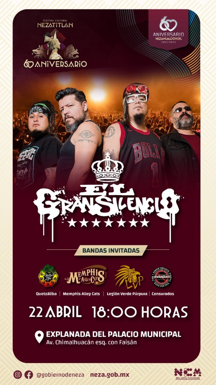 Como parte de los festejos por el 60 aniversario de la fundación del municipio de Nezahualcóyotl y como parte del Festival Cultural Nezatitlán 2023, en el que se desarrollarán diversas actividades culturales, educativas, musicales y conciertos, el próximo sábado 22 de abril se presentará la Banda de rock/ska El Gran Silencio en concierto gratuito en la Explanada de Palacio Municipal, así lo informó El Gobierno Municipal.