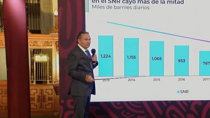“En 2004 se llegaron a producir en México más de 3.3 millones de barriles diarios y que cuando comenzó esta administración llegamos a un millones 642 mil, es menos de la mitad, una declinación constante a los largo de 15 años. Este es el comportamiento de este sexenio, partimos de la cifra de un millón 642 mil y año con año se ha habido venido incrementando la producción al punto de acuerdo con lo que nos instruyó el presidente de extraer solamente lo necesario para producir combustibles, ser autosuficientes en combustibles en el país”, expuso.