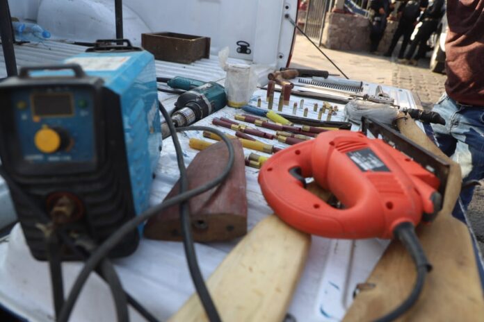Además, el conductor y su acompañante, poseían una sierra eléctrica, un taladro y una planta para soldar; también les fueron encontrados un machete y dos cuchillos de aproximadamente 30 centímetros de longitud.