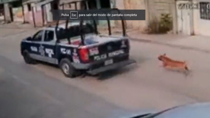 Una cámara de vigilancia captó el momento en que la patrulla con número PCC-114 de la Policía Municipal de Tuxtla Gutiérrez, Chiapas obligaba a correr desesperadamente a un perro, atado a la defensa trasera de la unidad.
