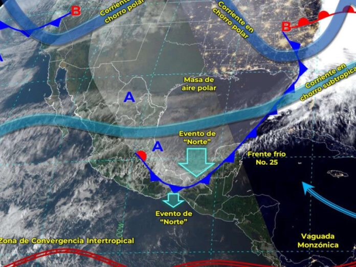 El frente frío 25 se desplazará sobre el oriente y sureste del país originando lluvias puntuales muy fuertes.