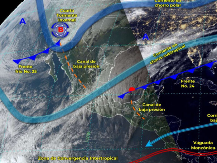 La Cuarta Tormenta Invernal se ubicará sobre el norte del país, mientras que el frente frío 25 recorrerá rápidamente el norte, noreste y hacia la noche ingresará al Golfo de México; ambos sistemas generarán lluvias, chubascos y vientos intensos con tolvaneras.