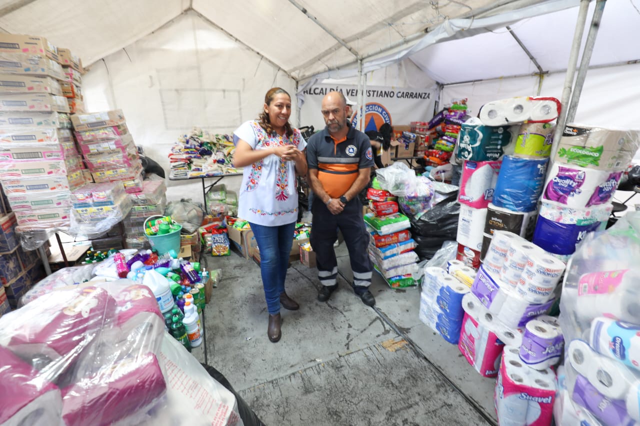 El centro de acopio, instalado en la explanada de la alcaldía en coordinación con Protección Civil, recibió alimentos no perecederos, agua embotellada, ropa, medicamentos básicos, artículos de higiene personal, productos de limpieza, cobijas, colchones y alimento para mascotas, además de dulces destinados a niñas y niños de las zonas damnificadas.