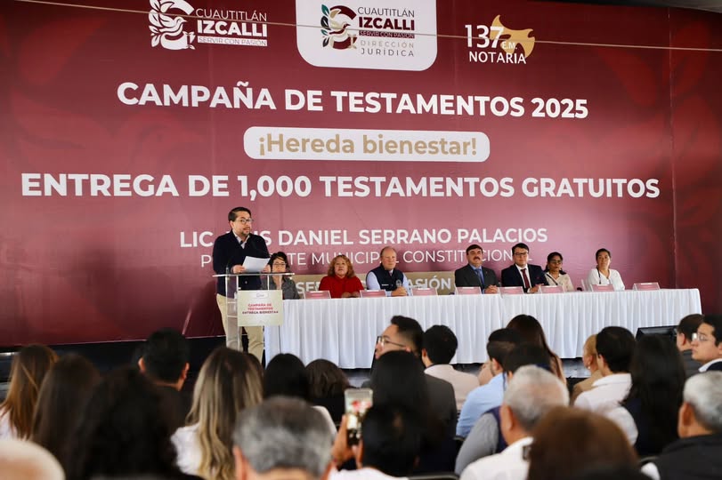 “Se gestionó un proyecto de testamentos gratuitos y a bajo costo para garantizar la seguridad jurídica y el bienestar de las familias izcallenses”, afirmó el presidente municipal Daniel Serrano Palacios, al encabezar la entrega de mil testamentos gratuitos como parte de la primera etapa de la campaña ¡Hereda Bienestar! impulsada por el Gobierno de Cuautitlán Izcalli.