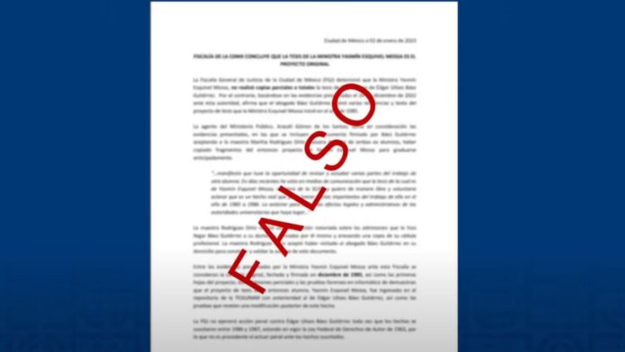 La Fiscalía General de Justicia capitalina (FGJ-CDMX) reiteró que es “absolutamente falso” que la institución haya resuelto que la Ministra Yasmin Esquivel Mossa fue víctima de plagio.