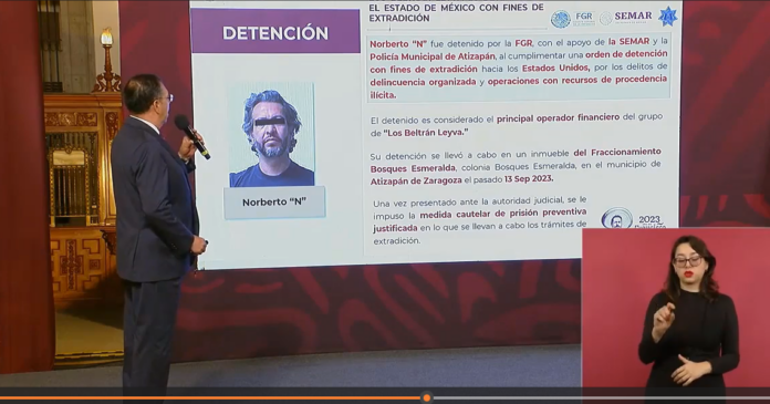 Atizapán de Zaragoza, Estado de México, a 20 de septiembre de 2023.- Destacan en Conferencia de Prensa Matutina de ayer 19 de septiembre, desde Palacio Nacional, en la Sección Cero Impunidad y relativo al período del 5 al 18 de septiembre, trabajo coordinado entre la Policía Municipal de Atizapán de Zaragoza y la Secretaría de Marina (SEMAR) en apoyo a una detención relevante hecha por la Fiscalía General de la República (FGR), la de Norberto “N”, cumpliendo así una orden de aprehensión con fines de extradición hacia los Estados Unidos por los delitos de delincuencia organizada y operaciones con recursos de procedencia ilícita.
