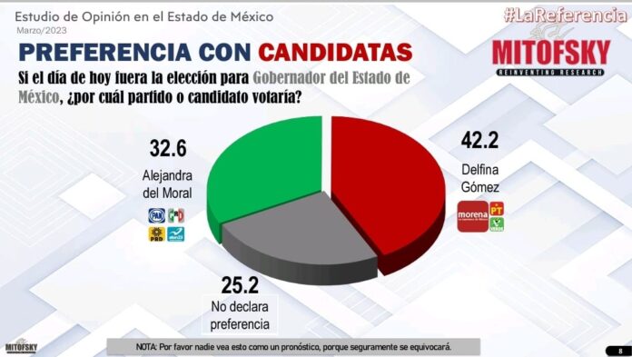 Por candidatas, Alejandra Del Moral cuenta con una preferencia de 32.6 por ciento y Delfina Gómez de 42.2, una diferencia de 9.6 por ciento, lo cual muestra que sigue creciendo en la intención de voto la precandidata electa del PRI, PAN, PRD y Panal.