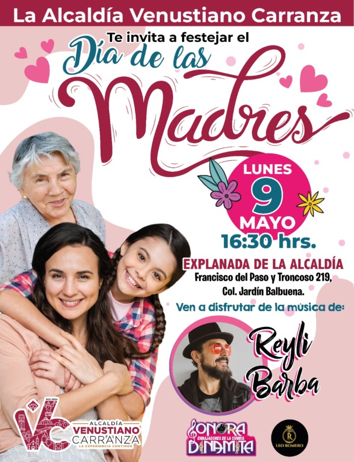 Evelyn Parra Álvarez, Alcaldesa de Venustiano Carranza, informó que su gobierno festejará el Día de las Madres el próximo lunes a partir de las 5 de la tarde, con un magnífico concierto del cantante Reyli Barba, quien interpretará sus grandes éxitos en la explanada de la demarcación.