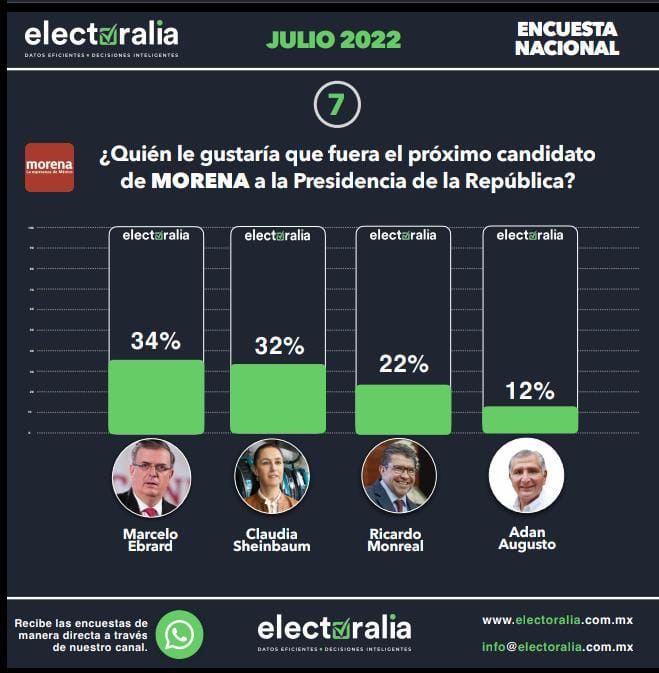 De acuerdo con la encuesta nacional de electoralia, de julio de 2022, el líder de las y los senadores de Morena, Ricardo Monreal Ávila, se posiciona con 22 por ciento de aceptación para ser el próximo candidato de su partido a la Presidencia de la República.