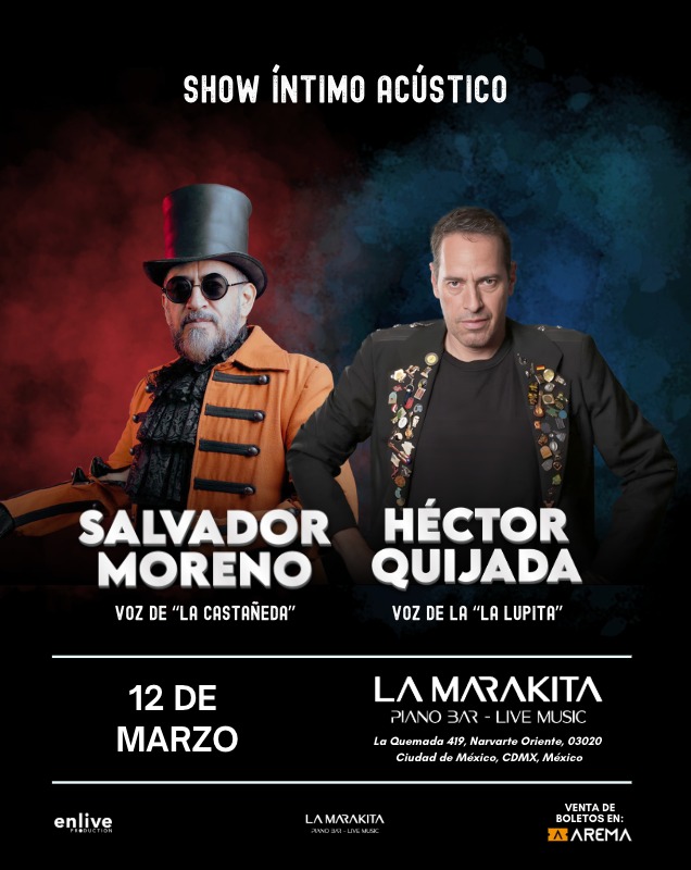 Salvador Moreno y Héctor Quijada se presentarán el próximo Jueves 12 de marzo en La Marakita Piano Bar Live Music, en la Ciudad de México, en punto de las 9 de la noche. La Marakita está ubicada en La Quemada 419, a un costado del estacionamiento de La Maraka. Los boletos ya se encuentran disponibles a través de Arema.mx Las reservaciones pueden realizarse directamente a los números telefónicos 55 56 82 06 36 y 55 88 32 00 19.