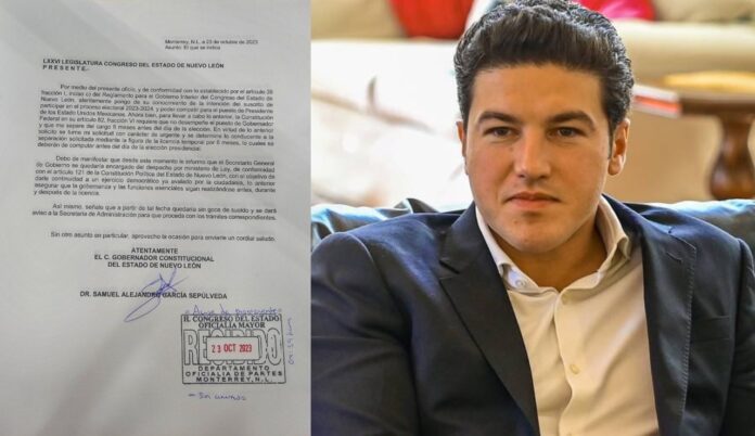 A través de la Consejería Jurídica de Nuevo León, el gobernador de Nuevo León, Samuel García Sepúlveda, solicitó al Congreso del Estado, con carácter de urgente, la aprobación de la licencia por seis meses para separarse del cargo y contender como candidato de Movimiento Ciudadano a la Presidencia de México en las elecciones del 2024.