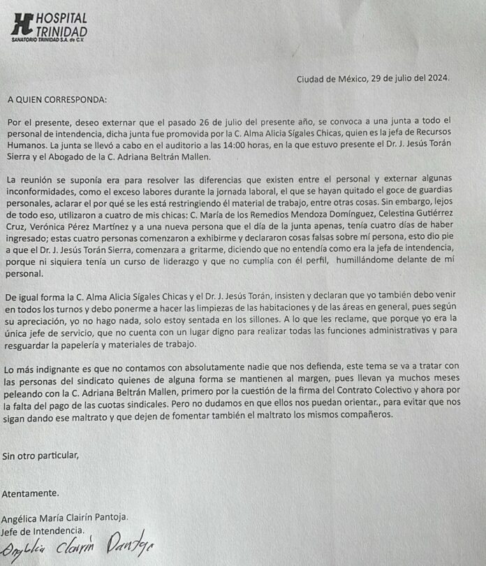 En un documento interno del 29 de julio del año pasado, Angélica Clairín Pantoja denunció que Adriana Beltrán Mallén generó junto con la Jefa de Recursos Humanos, Alma Sígales, una estrategia de fabricación de pruebas y argumentos en su contra a través de las propias colaboradoras de Clairín a las que “compraron”, mientras que el doctor Jesús Torán Sierra le gritó, humillándola ante el personal que ella lideraba como jefa de intendencia, luego de que como tal había reclamado que les generaron exceso de trabajo durante su jornada laboral, y les estaban restringiendo material para cumplir correctamente con sus labores de limpieza e higiene del sanatorio. Finalmente, renunció.