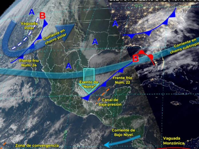 El frente frío 22 se extenderá sobre el oriente del Golfo de México y la Península de Yucatán, mantendrá las condiciones para lluvias e intervalos de chubascos en Puebla, Veracruz, Oaxaca, Chiapas, Tabasco y Campeche.
