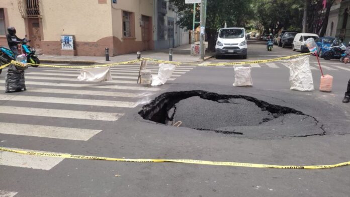 Un socavón de tres metros de profundidad se formó en calles de la colonia Roma, en la alcaldía Cuauhtémoc, lo que pone en riesgo la movilidad de los vehículos que transitan en la zona.