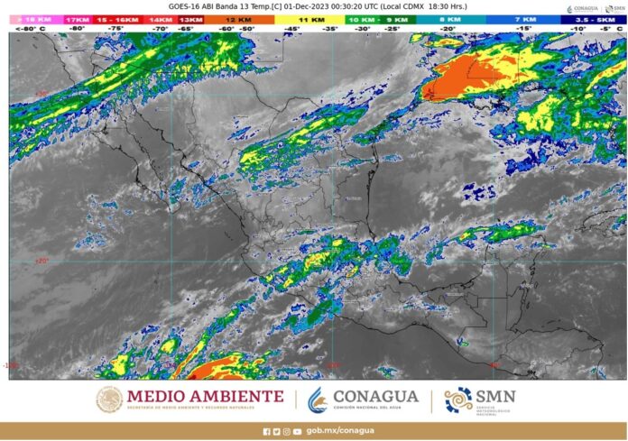 Durante la noche de este jueves, un canal de baja presión sobre el oriente de México, el ingreso de humedad de ambos océanos e inestabilidad en niveles altos de la atmósfera ocasionarán lluvias fuertes (de 25 a 50 milímetros [mm]) en Michoacán y Quintana Roo; chubascos (de 5 a 25 mm) en Campeche, Chiapas, Ciudad de México, Colima, Estado de México, Guanajuato, Guerrero, Jalisco, Morelos, Oaxaca, Puebla, Tabasco, Veracruz y Yucatán, y lluvias aisladas (de 0.1 a 5 mm) en Hidalgo, Querétaro y Tlaxcala. Se acompañarán de descargas eléctricas y rachas de viento de 40 kilómetros por hora (km/h).