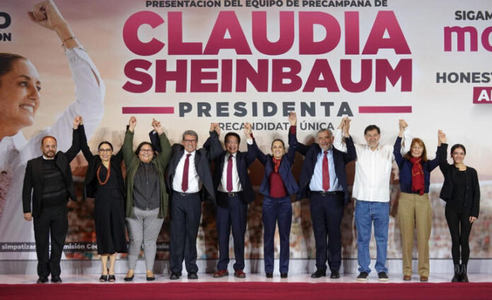 La precandidata de Morena, PT y PVEM para la Presidencia de la República en 2024 , Claudia Sheinbaum, presentó este lunes a su equipo de precampaña, entre los que se encuentran dirigentes nacionales del partido al que pertenece, así como sus contrincantes durante el proceso interno para elegir al coordinador de los comités de defensa de la Cuarta Transformación. Mario Delgado, presidente nacional de Morena, será el coordinador de precampaña de Sheinbaum, mientras que anunció a Adán Augusto López, exsecretario de Gobernación, como su coordinador político; al senador Ricardo Monreal, coordinador de enlace territorial, y Gerardo Fernández Noroña, diputado federal por el PT, coordinador de enlace con organizaciones sociales y vocero de campaña.