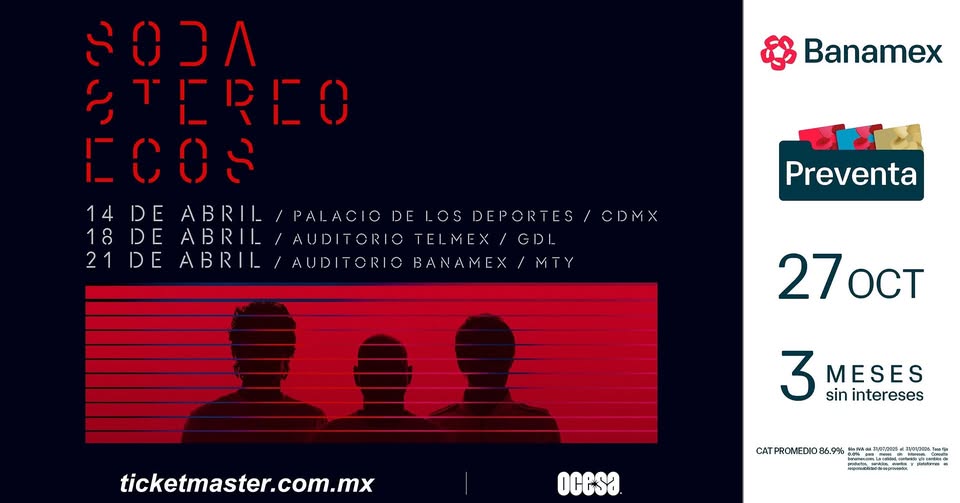 El año 2026 pasará a la posteridad para recordarnos que hay conciertos que no se escuchan: se habitan, se viven. Tras ocho fechas agotadas en Argentina, más de 100 mil boletos vendidos y un cúmulo de emociones contenidas, la leyenda del rock, Soda Stereo, anuncia su regreso a México con tres fechas: 14 de abril, Palacio de los Deportes – CDMX, 18 de abril, Auditorio Telmex – GDL y 21 de abril en el Auditorio Banamex, MTY.