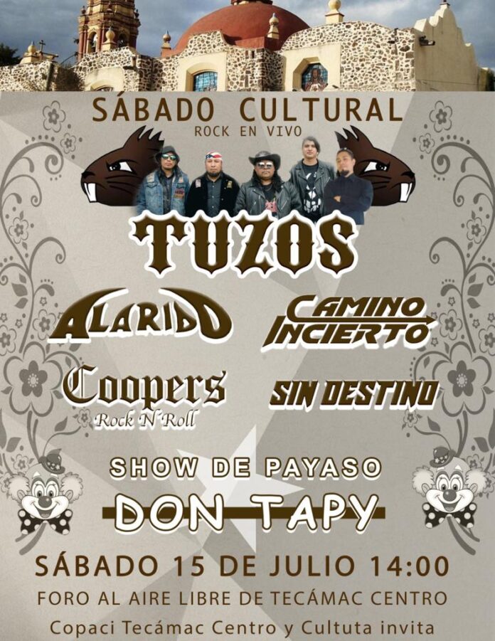 Como parte de la cartela cultural, el foro al aire libre de Tecámac Centro será el escenario para la tocada de rock que el gobierno municipal preparó para este sábado, en la que participarán las bandas Tuzos, Alarido, Camino Incieto, Coopers y Sin Destino y como colofón el show del Payaso Don Tapy. Los amantes de este género pueden asistir a partir de las 14:00 horas, y sin duda podrán disfrutar de una excelente jornada musical.