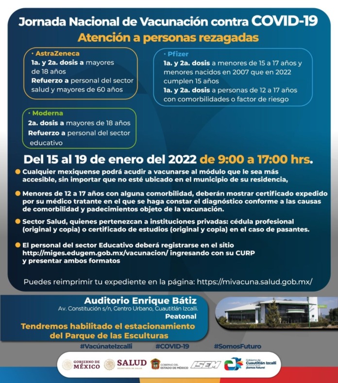 El Gobierno de Cuautitlán Izcalli informa que del sábado 15 al miércoles 19 de enero, se aplicarán dosis de la vacuna contra COVID-19 a las personas rezagadas o a aquellos mexiquenses de distintos grupos que por diversas razones no se han vacunado o que les falta completar su esquema con la segunda dosis.