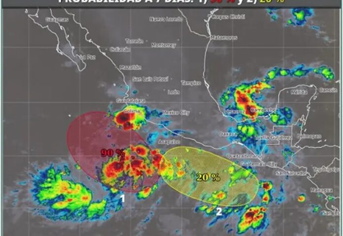 La zona de baja presión frente a las costas de Guerrero, Michoacán y Colima, incrementó a 90 por ciento de probabilidad para desarrollo ciclónico en 48 horas y mantiene 90 por ciento en 7 días.