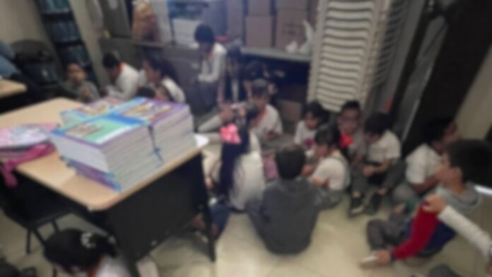 En la imagen se puede observar a varios menores sentados en el suelo y debajo de escritorios a la espera de que terminen los disparos al exterior de su colegio.