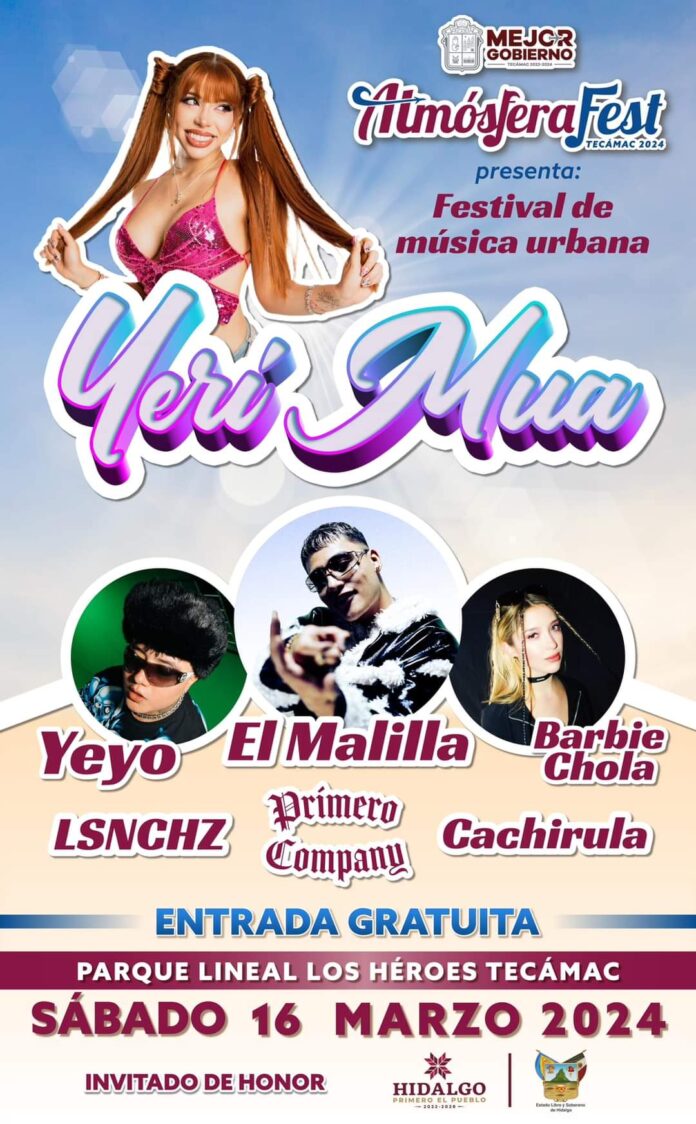 La célebre influencer y cantante Yeri Mua encabezará el gran elenco del sábado 16 de marzo, como parte de la gran cartelera del segundo día de actividades del festival cultural y artístico Atmósfera 2024, jornada que estará dedicada a la música urbana.
