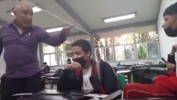 “Yo si te rompo tu madre, chamaquito pendejo”, suelta el profesor al alumno, que no deja de reirse junto a sus compañeros.